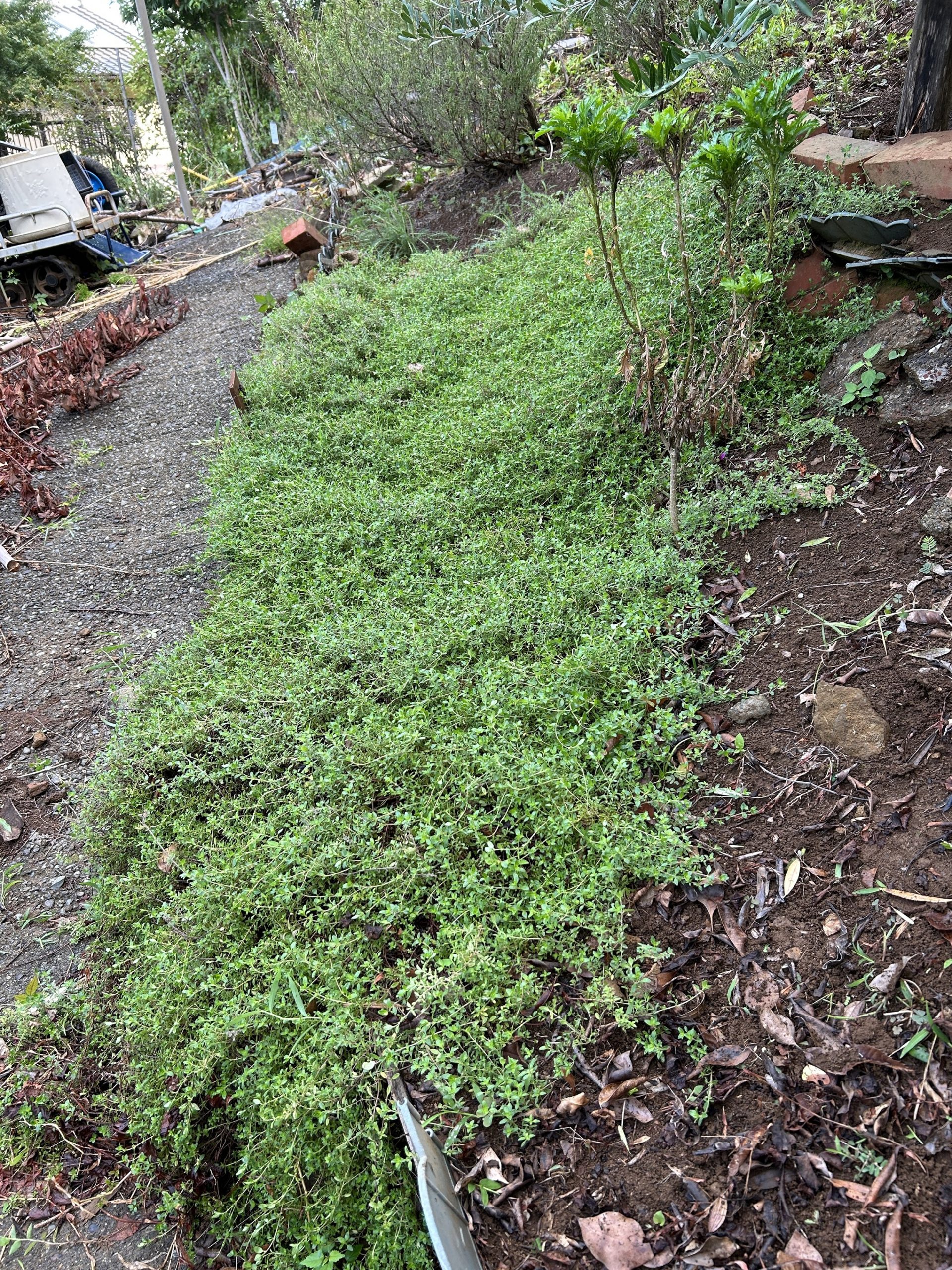 前夜来の雨でタイムが生き生きと輝いていた。このあたりはタイムで覆われそうだ。