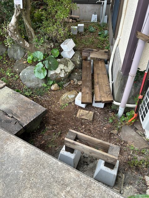 先ずは基礎のブロックを置いて柱建てと梁を作った。狭い場所での
