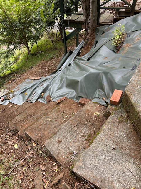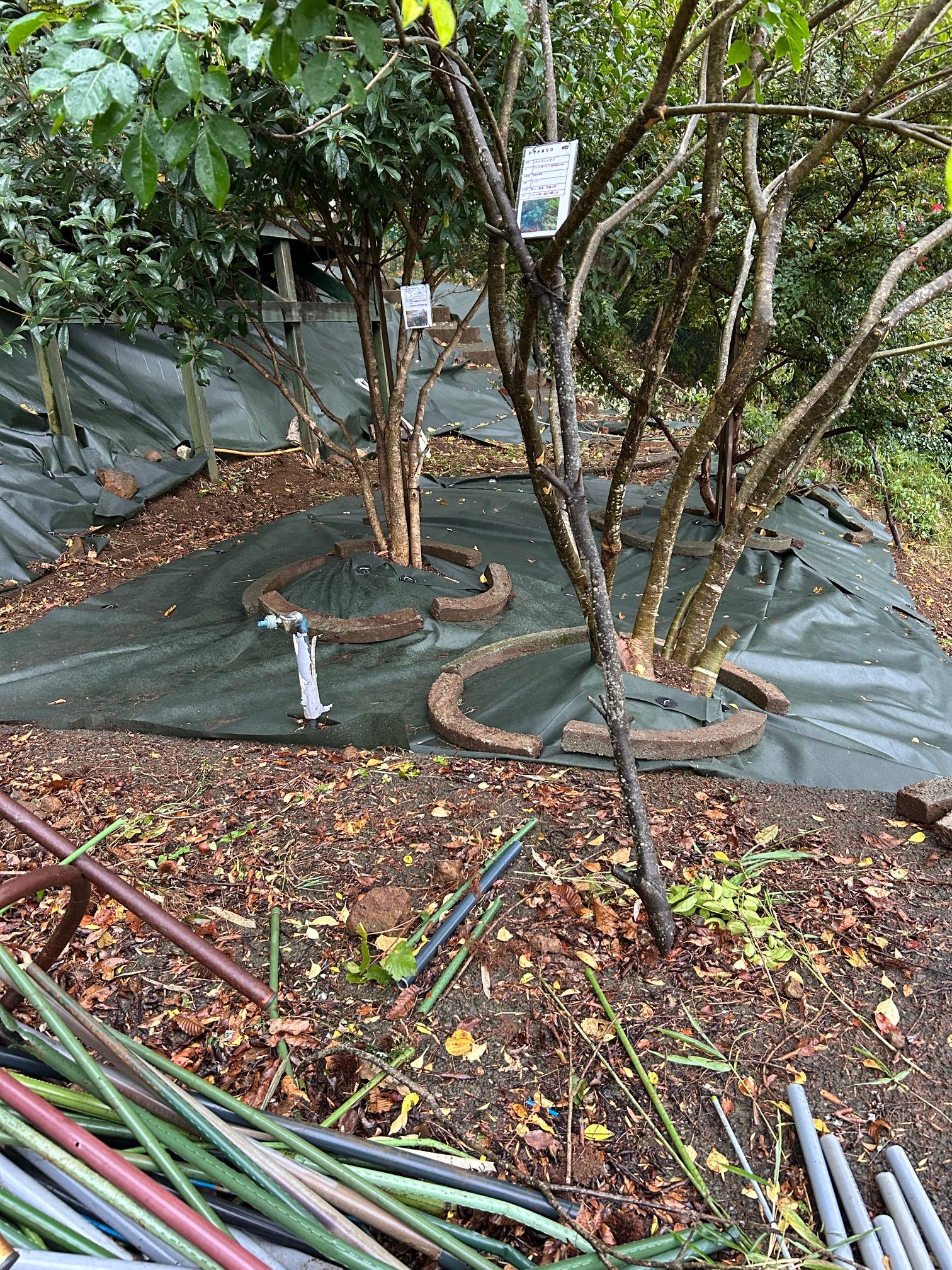 トネリコ、金木犀、レンギョウの周りの雑草を取り除いてから防草シートをはった。