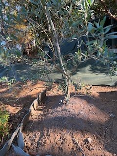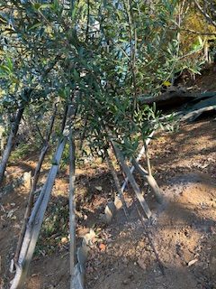 季節風が強くなってきたので、オリーブの支柱を強化し、根元に石灰と土を入れた。